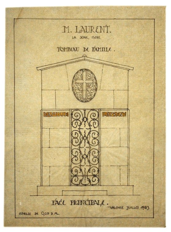 DESCRIPTION Architectes : Joulie Henri ; Bissuel Joseph Nature du projet : Tombeau de la famille Laurent Lieu : La Sône ; Isère (FR) Techniques : Dessin sur calque ; encre de Chine ; encre noire ; crayon pastel Dimensions : L = 25,1 cm ; l = 34,8 cm Dates du projet…