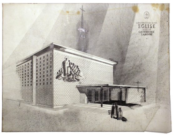 DESCRIPTION Architectes : Joulie Michel Nature du projet : Église Saint-Catherine Labouré ; construction de l’église ; presbytère Lieu : Valence ; Drôme (FR) Techniques : Dessin sur calque ; mine de plomb ; encre de Chine ; encre noire Dimensions : L = 69 cm ; l = 52,8 cm Dates du…