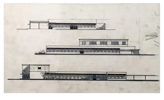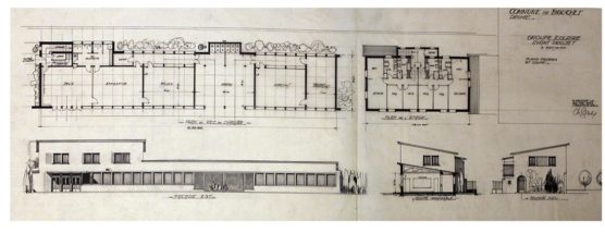 DESCRIPTION Architectes : Joulie Michel Nature du projet : Groupe scolaire ; projet de réalisation Lieu : Bouchet ; Drôme (FR) Techniques : Dessin sur calque ; encre de Chine ; encre noire Dimensions : L = 105,5 cm ; l = 37,8 cm Dates du projet : 1962 Signature : Dessin signé…