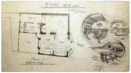 DESCRIPTION Architectes : Joulie Henri ; Joulie Michel Nature du projet : Maison d’habitation de M. Bonnet ; aménagement intérieur Lieu : Aubenas ; Ardèche (FR) Techniques : Dessin sur calque ; mine de plomb Dimensions : L = 70,5 cm ; l = 38 cm Dates du projet : 1937-1938 / 1949-1950…