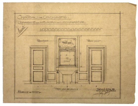 DESCRIPTION Architectes : Joulie Henri ; Bissuel Joseph Nature du projet : Château de Cachard ; projet d’aménagement intérieur Lieu : Boffres ; Ardèche (FR) Techniques : Dessin sur calque ; mine de plomb Dimensions : L = ? cm ; l = ? cm Dates du projet : 1921-1922 Signature : Dessin…