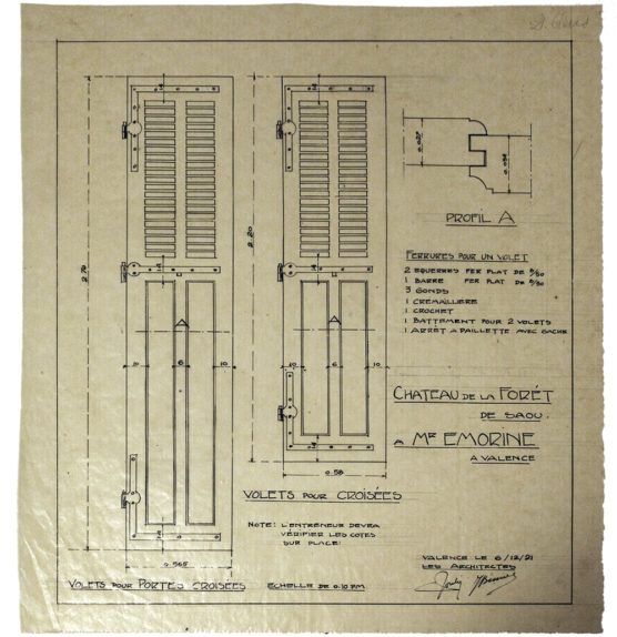 DESCRIPTION Architectes : Joulie Henri ; Bissuel Joseph Nature du projet : Château de Saoû ; aménagement Lieu : Saoû ; Drôme (FR) Techniques : Dessin sur calque ; encre de Chine ; encre noire Dimensions : L = ? cm ; l = ? cm Dates du projet : 1921 Signature :…