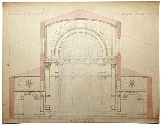 DESCRIPTION Architectes : Anonyme Nature du projet : Église Saint-Cannat à Marseille ; projet de restauration de l’église Lieu : Marseille ; Bouches-Du-Rhône (FR) Techniques : Dessin sur papier ; encre de Chine ; encre noire ; mine de plomb ; aquarelle Dimensions : L = 60,5 cm ; l = 47 cm…