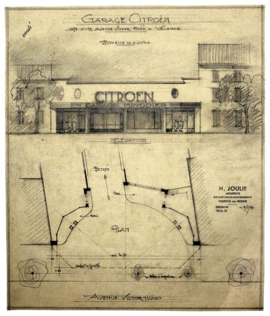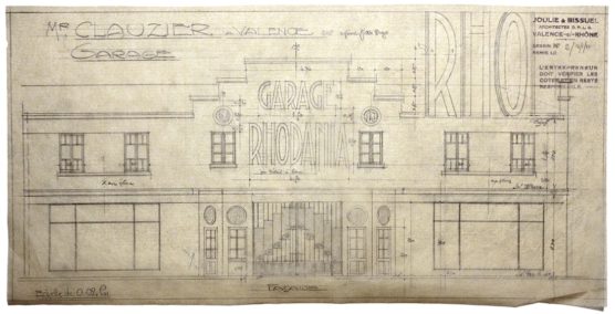 DESCRIPTION Architectes : Joulie Henri ; Bissuel Joseph Nature du projet : Garage Rhodania Lieu : Valence ; Drôme (FR) Techniques : Dessin sur calque ; mine de plomb Dimensions : L = 55 cm ; l = 27,6 cm Dates du projet : 1931 / 1939 / 1948 Signature : Dessin signé…