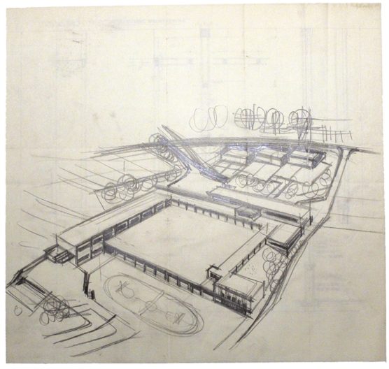 DESCRIPTION Architectes : Joulie Michel Nature du projet : Groupe scolaire des Vans Lieu : Les Vans ; Ardèche (FR) Techniques : Dessin sur papier ; mine de plomb Dimensions : L = 45 cm ; l = 43 cm Dates du projet : 1962 Signature : Dessin non signé, attribué à Michel…