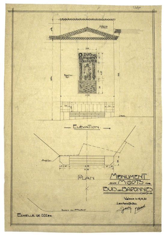 DESCRIPTION Architectes : Joulie Henri ; Bissuel Joseph Nature du projet : Monument aux morts de Buis-les-Baronnies Lieu : Buis-les-Baronnies ; Drôme (FR) Techniques : Dessin sur calque ; encre de Chine ; encre noire Dimensions : L = ? cm ; l = ? cm Dates du projet : 1921-1923 Signature :…
