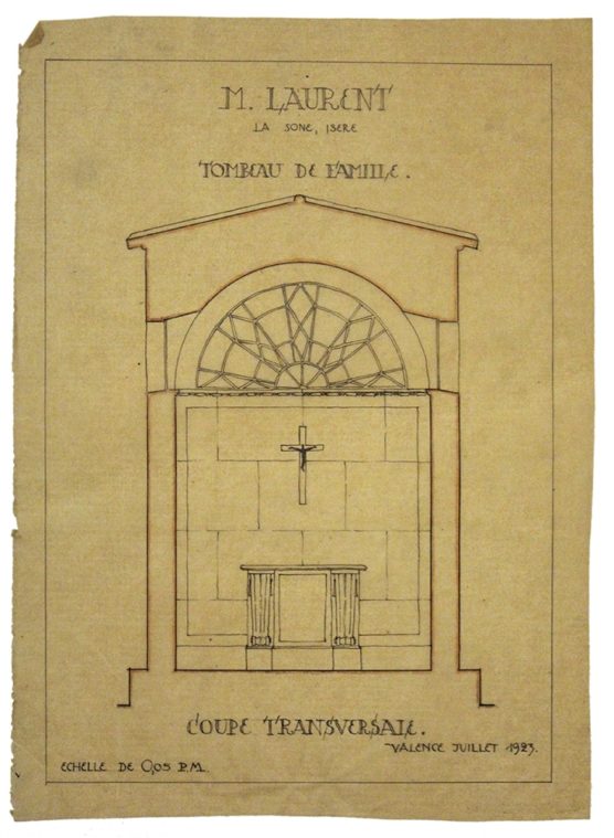 DESCRIPTION Architectes : Joulie Henri ; Bissuel Joseph Nature du projet : Tombeau de la famille Laurent Lieu : La Sône ; Isère (FR) Techniques : Dessin sur calque ; encre de Chine ; encre noire ; crayon pastel Dimensions : L = 24,8 cm ; l = 34,8 cm Dates du projet…