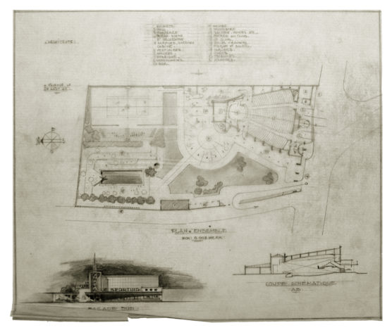 DESCRIPTION Architectes : Joulie Michel Nature du projet : Cinéma : études documentaires sur les cinémas (pour le projet du cinéma « Le Vox » de Montélimar) Lieu : Montélimar, Drôme (FR) Techniques : Dessin sur calque ; mine de plomb Dimensions : L = 42,5 cm ; l = 36,5 cm Dates du projet…