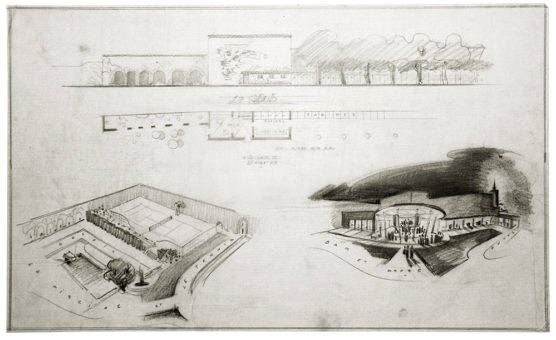 DESCRIPTION Architectes : Bossan Pierre-Marie ; Rey Joannis Nature du projet : Église Notre-Dame à Aouste-sur-Sye ; projet de construction Lieu : Aouste-sur-Sye ; Drôme (FR) Techniques : Dessin sur papier ; calque contrecollé ; encre de Chine ; encre noire ; encre rouge ; aquarelle Dimensions : L = 50,2 cm ;…