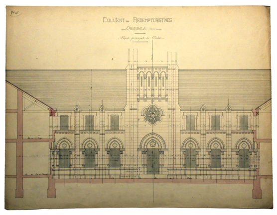 DESCRIPTION Architectes : REY Joannis (?) Nature du projet : Couvent des Redemptoristines Lieu : Valence, Drôme (FR) Techniques : Dessin sur papier ; encre de Chine ; encre noire ; encre rouge ; aquarelle Dimensions : L = 65 ; l = 50,2 cm Dates du projet : 1879 Signature : Dessin…