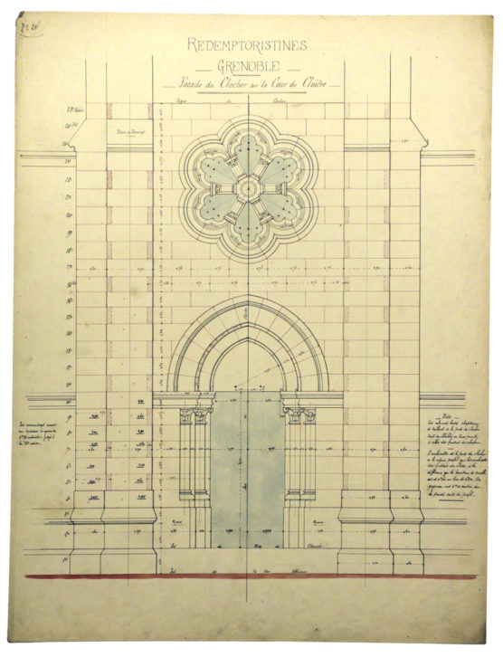 DESCRIPTION Architectes : REY Joannis (?) Nature du projet : Couvent des Redemptoristines Lieu : Valence, Drôme (FR) Techniques : Dessin sur papier ; encre de Chine ; encre noire ; encre rouge ; aquarelle Dimensions : L = 47,3 cm ; l = 62,5 cm Dates du projet : 1879 Signature :…