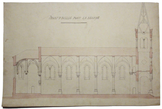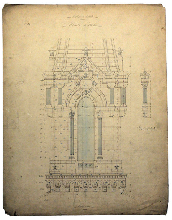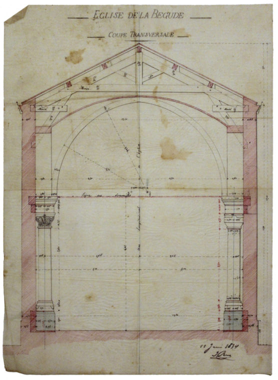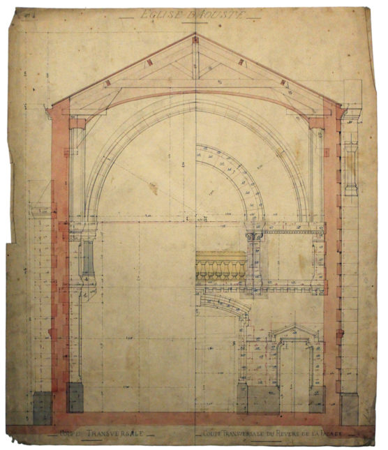 DESCRIPTION Architectes : Rey Joannis ; Bossan Pierre-Marie ; Chauffeur Auguste Nature du projet : Église de la Bégude ; projet d’église ; reprise de travaux Lieu : Châteauneuf-de-Mazenc ; Drôme (FR) Techniques : Dessin sur calque ; encre de Chine ; encre noire ; encre rouge ; aquarelle Dimensions : L =…