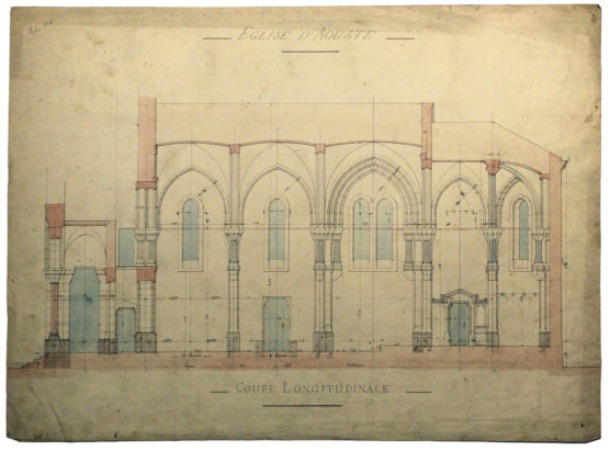 DESCRIPTION Architectes : Bossan Pierre-Marie ; Rey Joannis Nature du projet : Église Notre-Dame à Aouste-sur-Sye ; projet de construction Lieu : Aouste-sur-Sye ; Drôme (FR) Techniques : Dessin sur papier ; encre de Chine ; encre noire ; encre rouge ; aquarelle Dimensions : L = 61,5 cm ; l = 45,8…