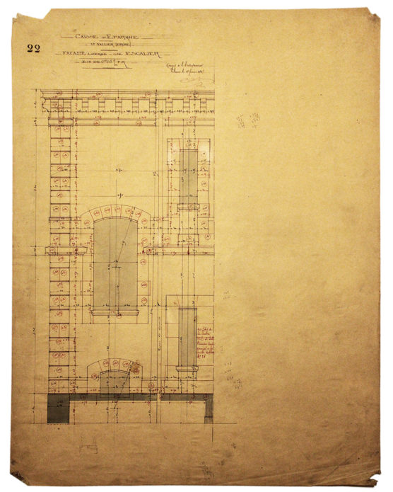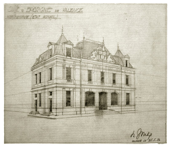 DESCRIPTION Architectes : Joulie Michel Nature du projet : Caisse d’Épargne Lieu : Valence, Drôme (FR) Techniques : Dessin sur calque ; mine de plomb Dimensions : L = 22,5 cm ; l = 19,4 cm Dates du projet : 1956-1958 Signature : Dessin signé Michel Joulie Compléments historiques : – Localisation…