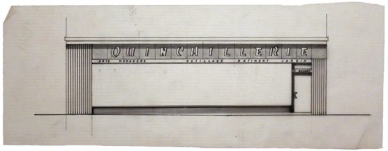 DESCRIPTION Architectes : Joulie Michel Nature du projet : Magasin « Quincaillerie Besson » ; projet de devanture Lieu : Saint-Vallier ; Drôme (FR) Techniques : Dessin sur calque ; encre de Chine ; encre noire Dimensions : L = 37,7 cm ; l = 14,7 cm Dates du projet : 1971 Signature : Dessin…