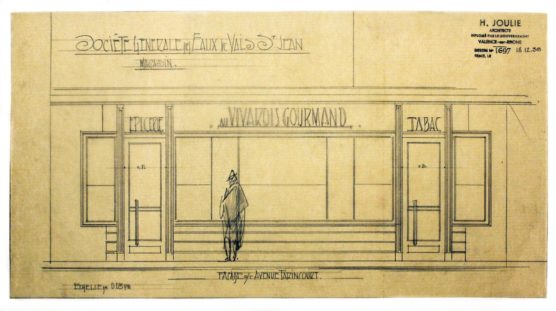 DESCRIPTION Architectes : Joulie Michel Nature du projet : Magasin « Au Vivarais Gourmand » ; garage et étalage de magasin à Vals-les-Bains Lieu : Vals-les-Bains ; Ardèche (FR) Techniques : Dessin sur calque ; mine de plomb Dimensions : L = 54 cm ; l = 28,7 cm Dates du projet : 1938 Signature…