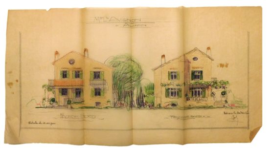 DESCRIPTION Architectes : Joulie Henri Nature du projet : Maison d’habitation de M. Avignon Lieu : Alixan ; Drôme (FR) Techniques : Dessin sur calque ; mine de plomb ; pastel ; aquarelle Dimensions : L = 61,3 cm ; l = 31,6 cm Dates du projet : 1927 Signature : Dessin signé…