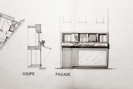 DESCRIPTION Architectes : Joulie Michel Nature du projet : Librairie-papeterie Raynaud Lieu : Saint-Vallier ; Drôme (FR) Techniques : Dessin sur calque ; encre de Chine ; encre noire Dimensions : L = 105,8 cm ; l = 57 cm Dates du projet : 1964-1965 Signature : Dessin non signé, attribué à Michel…