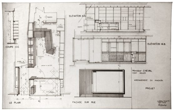 DESCRIPTION Architectes : Joulie Michel Nature du projet : Magasin de M. Cheval ; projet d’aménagement du magasin Lieu : Saint-Vallier ; Drôme (FR) Techniques : Dessin sur calque ; encre de Chine ; encre noire Dimensions : L = 88,5 cm ; l = 55,9 cm Dates du projet : 1964 Signature…