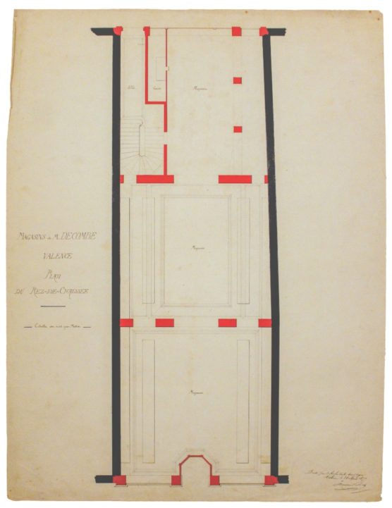 DESCRIPTION Architectes : Rey Joannis Nature du projet : Magasins de M. Decombe Lieu : Valence ; Drôme (FR) Techniques : Dessin sur papier ; mine de plomb ; encre de Chine ; encre noire ; encre rouge Dimensions : L = 48 cm ; l = 62,8 cm Dates du projet :…