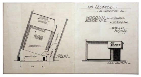 DESCRIPTION Architectes : Joulie Michel Nature du projet : Magasin de M. Léopold ; projet de rénovation de magasin Lieu : Valence ; Drôme (FR) Techniques : Dessin sur calque ; encre de Chine ; encre noire Dimensions : L = 45,5 cm ; l = 24 cm Dates du projet : 1968…