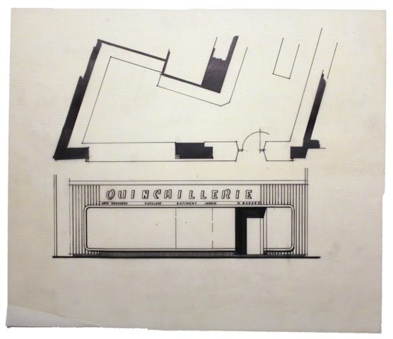 DESCRIPTION Architectes : Joulie Michel Nature du projet : Magasin « Quincaillerie Besson » ; projet de devanture Lieu : Saint-Vallier ; Drôme (FR) Techniques : Dessin sur calque ; encre de Chine ; encre noire Dimensions : L = 36,8 cm ; l = 33,2 cm Dates du projet : 1971 Signature : Dessin…