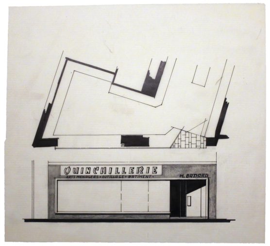 DESCRIPTION Architectes : Joulie Michel Nature du projet : Magasin « Quincaillerie Besson » ; projet de devanture Lieu : Saint-Vallier ; Drôme (FR) Techniques : Dessin sur calque ; encre de Chine ; encre noire Dimensions : L = 38,8 cm ; l = 33 cm Dates du projet : 1971 Signature : Dessin…
