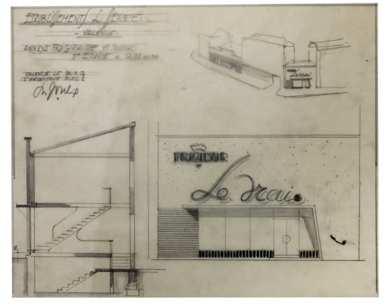 DESCRIPTION Architectes : Joulie Michel Nature du projet : Magasin de nougat « Maison Soboul » Lieu : Montélimar ; Drôme (FR) Techniques : Dessin sur calque ; mine de plomb Dimensions : L = 81,4 cm ; l = 46,8 cm Dates du projet : 1955 Signature : Dessin signé Michel Joulie Compléments historiques…