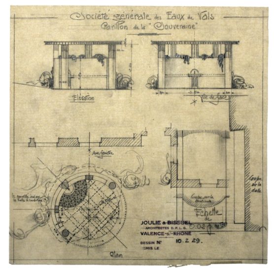 DESCRIPTION Architectes : Joulie Henri ; Bissuel Joseph Nature du projet : Pavillon de la « Souveraine », Source « La Souveraine » Lieu : Vals-les-Bains ; Ardèche (FR) Techniques : Dessin sur calque ; mine de plomb Dimensions : L = 30,5 cm ; l = 30,5 cm Dates du projet : 1928-1929 Signature : Dessin…