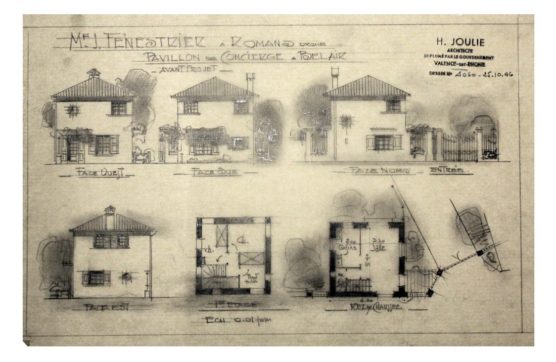 DESCRIPTION Architectes : Joulie Henri Nature du projet : Pavillon de concierge à Bel Air Lieu : Romans-sur-Isère ; Drôme (FR) Techniques : Dessin sur calque ; mine de plomb Dimensions : L = 44,5 cm ; l = 29 cm Dates du projet : 1946-1953 Signature : Dessin signé Henri Joulie (cachet…