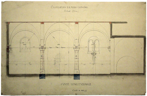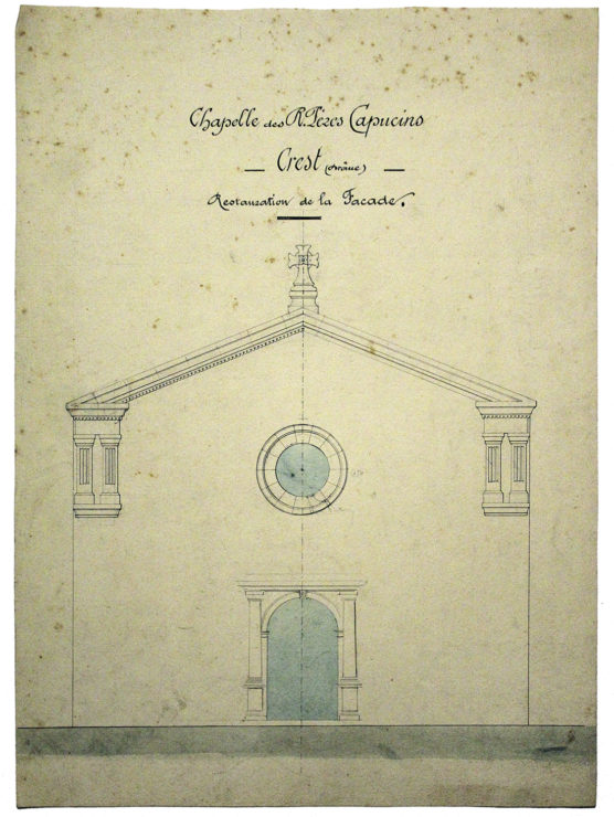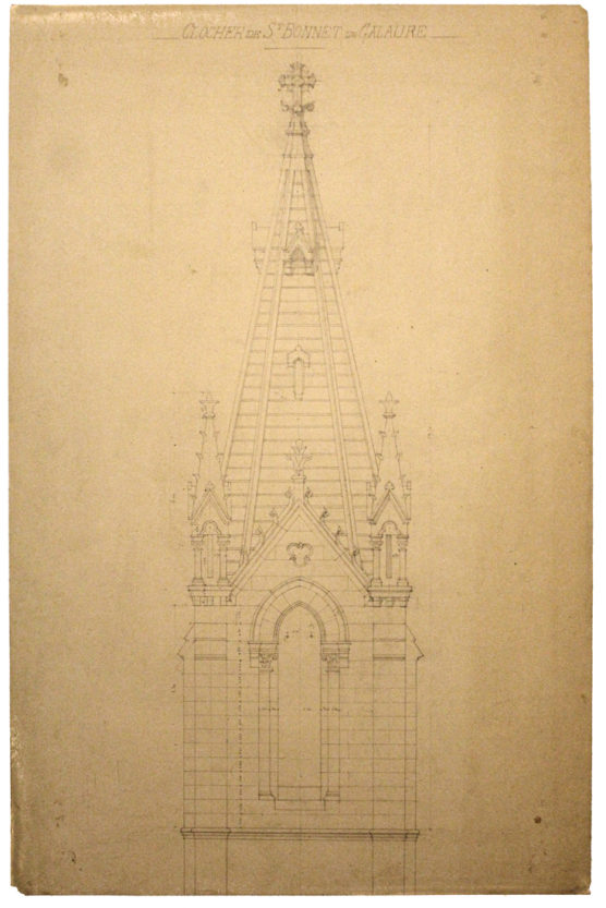 DESCRIPTION Architectes : Rey Joannis Nature du projet : Église Saint-Bonnet-de-Galaure ; projet d’agrandissement et de restauration de la nef ; établissement du clocher Lieu : Châteauneuf-de-Galaure ; Drôme (FR) Techniques : Dessin sur papier ; mine de plomb Dimensions : L = 32,8 cm ; l = 50,2 cm Dates du projet…