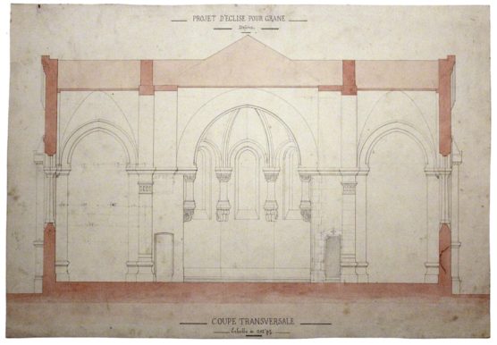 DESCRIPTION Architectes : Rey Joannis Nature du projet : Église Saint-Jean-Baptiste à Grane ; projet d’église paroissiale Lieu : Grane ; Drôme (FR) Techniques : Dessin sur papier ; encre de Chine ; encre noire ; mine de plomb Dimensions : L = 50,5 cm ; l = 35 cm Dates du projet…