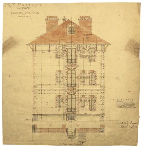 DESCRIPTION Architectes : Rey Joannis (?) ; Joulie Henri Nature du projet : Maison d’habitation de M. E. Barneron ; appartement de M. Muletier Lieu : Valence ; Drôme (FR) Techniques : Dessin sur papier ; encre de Chine ; encre noire ; encre rouge ; aquarelle Dimensions : L = 46 cm…