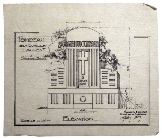 DESCRIPTION Architectes : Joulie Henri, Bissuel Joseph Nature du projet : Tombeau de la famille Laurent Lieu : Saint-Nazaire-en-Royans ; Drôme (FR) Techniques : Dessin sur calque ; encre de Chine Dimensions : L = 32,8 cm ; l = 28 cm Dates du projet : 1923 Signature : Dessin signé Henri Joulie…
