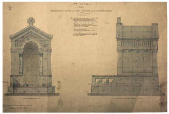 DESCRIPTION Architectes : Rey Joannis (?) Nature du projet : Chapelle funéraire de M. Cara Lieu : Tain-L’hermitage ; Drôme (FR) Techniques : Dessin sur papier ; encre de Chine ; encre noire ; encre rouge ; aquerelle Dimensions : L = 61,4 cm ; l = 41 cm Dates du projet :…