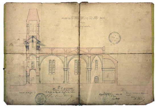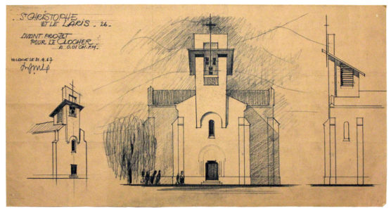 DESCRIPTION Architectes : Bulot H. ; Joulie Michel Nature du projet : Église Saint-Christophe à Saint-Christophe-et-le-Laris ; réfection du clocher Lieu : Saint-Christophe-et-le-Laris ; Drôme (FR) Techniques : Dessin sur papier contrecollé ; encre de Chine ; encre noire ; encre rouge ; aquarelle ; mine de plomb Dimensions : L = 48,8…