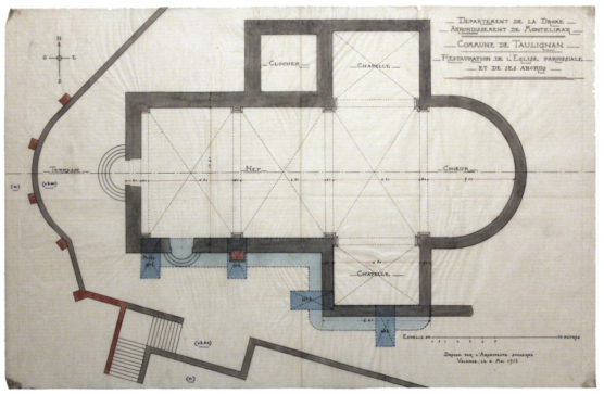 DESCRIPTION Architectes : Anonyme Nature du projet : Église Saint-Vincent ; projet de restauration de l’église paroissiale et de ses abords Lieu : Taulignan ; Drôme (FR) Techniques : Dessin sur calque ; encre de Chine ; encre noire ; encre rouge ; aquarelle Dimensions : L = 47 cm ; l =…