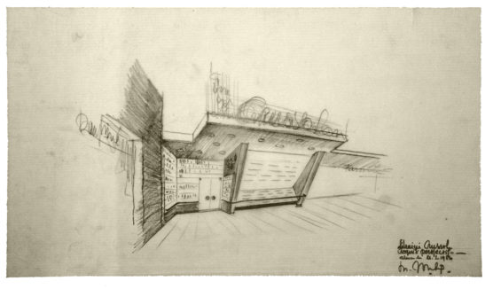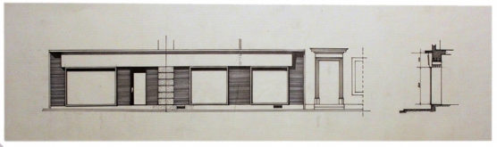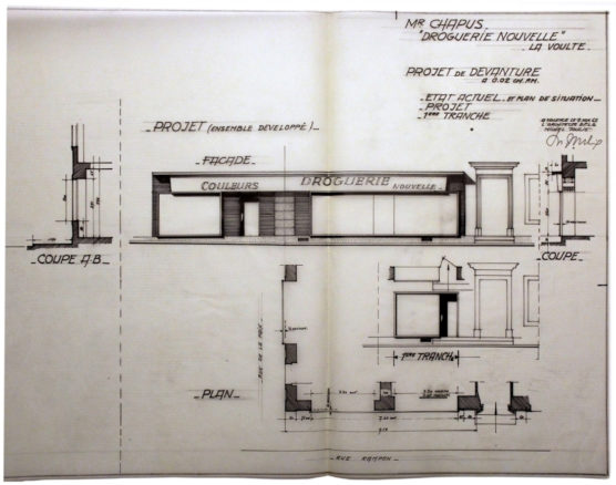 DESCRIPTION Architectes : Joulie Michel Nature du projet : Magasin « La Droguerie Nouvelle » de M. Chapuis ; projet de devanture Lieu : La Voulte-sur-Rhône ; Ardèche (FR) Techniques : Dessin sur calque ; encre de Chine ; encre noire Dimensions : L = 63,8 cm ; l = 19 cm Dates du projet…